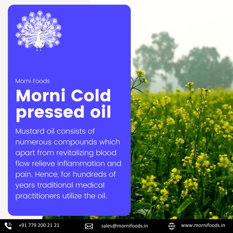 The best brand of edible oil in the nation is Morni Kachi ghani Kolhu mustard oil or Cold Pressed Mustard oil or Sarso ka tel. Indian households have been using it for more than a decade. A specific selection of carefully obtained mustard seeds are used to create Kachi Ghani Mustard Oil. The taste of food cooked in Kohlu oil is improved by maintaining the oil's high pungency, flavours, and natural qualities while crushing the seeds at controlled temperatures.