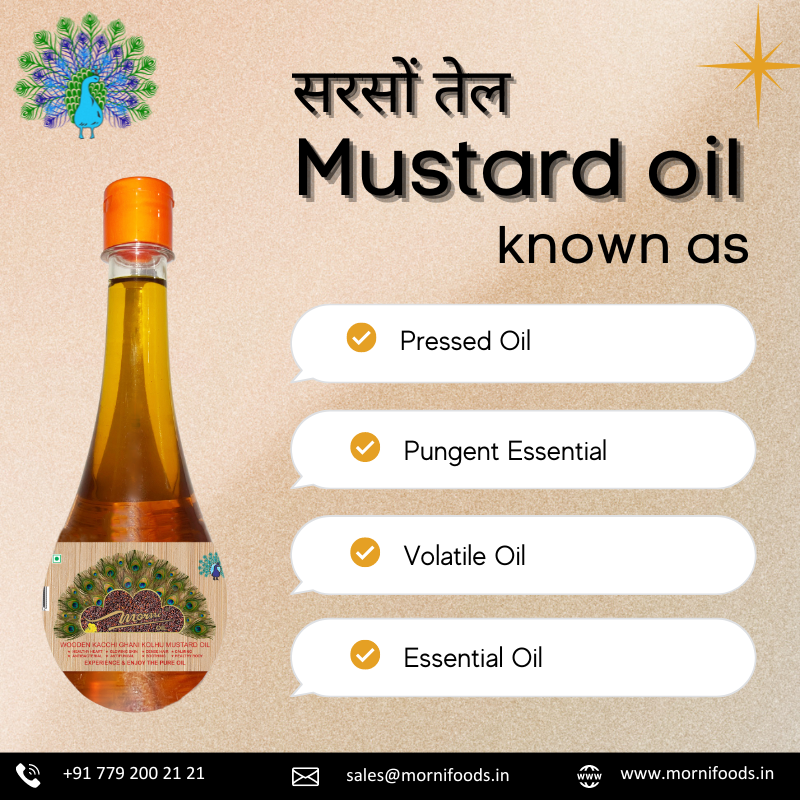 In Hindi, mustard oil is known as Kachi Ghani oil. The term "Kachi Ghani" refers to the cold-press method of obtaining oil from mustard seeds. The seeds are crushed at a low temperature to preserve the oil's natural components.