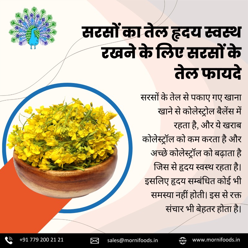 2.Encourages Heart Health According to a study published in the American Journal of Clinical Nutrition, including mustard oil in your daily diet may benefit your heart health. Because it is high in MUFA, it lowers bad cholesterol in the body, keeping blood fat levels in check and aiding in circulation. The findings also revealed that using mustard oil, which is high in alpha-linolenic acid, was associated with a lower risk of IHD (Ischemic Heart Disease) than using sunflower oil.